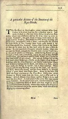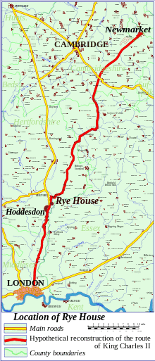 Rye House, located north-east of Hoddesdon, Hertfordshire, was a fortified mediaeval mansion surrounded by a moat.[1] The house was leased by a republican and Civil War veteran, Richard Rumbold. The plan was to conceal a force of men in the grounds of the house and ambush the King and the Duke as they passed by on their way back to London from the horse races at Newmarket. The "Rye House plotters", an extremist Whig group who are now named for this plot, allegedly adopted the plan out of a number of possibilities, having decided that it gave tactical advantages and could be carried out with a relatively small force operating with guns from good cover.[2]