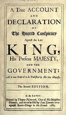A royal declaration of the heinous nature of the plot was issued on 27 July.[26] Many more were arrested. Although the principal conspirators were minor figures, and not directly concerned in the "Monmouth cabal", the court party made no distinction between the groups. The ministers involved may have known Ferguson but not West; Meade had sheltered the Covenanter John Nisbet, and may well have known of the plans for a rebellion.[24] William Carstares, a Church of Scotland minister and intermediary with the Whig grandees, was found in Kent on 23 July.[27]