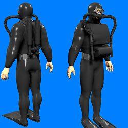 The breathing bag is square with rounded corners, on his chest, exposed. Its absorbent canister is cylindrical with flat ends, crosswise on his belly, in a rubber sheath. It has a loop of wide corrugated breathing tubes; one of them originates at each end of the canister; the right tube has a side connection to let gas in and out of the breathing bag as he breathes. It has two long thin oxygen cylinders lengthwise on his back. It can be supplied with a mouthpiece with a neck strap; the mouthpiece has a valve on its front to close the breathing tubes when the mouthpiece is not in his mouth. Its dive duration is about 3 hours.