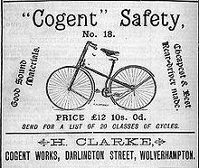 A safety bicycle (or simply a safety) is a type of bicycle that became very popular beginning in the late 1880s as an alternative to the penny-farthing ("ordinary") and is now the most common type of bicycle. Early bicycles of this style were known as safety bicycles because they were noted for, and marketed as, being safer than the high wheelers they were replacing.[1] Even though modern bicycles use a similar design, the term is rarely used today and is considered obsolete outside circles familiar with high wheelers.[2]