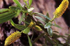 It is a deciduous large shrub or small tree growing to 4–11 m (13–36 ft) tall. The shoots are greenish-brown to grey-brown. The leaves are narrow elliptic to lanceolate, 4–17 cm long and 1-3.5 cm broad, glossy dark green above, usually glaucous green below, hairless or thinly hairy. The flowers are yellow catkins 1–9 cm long, produced in late spring after the leaves emerge.[2][3][4]