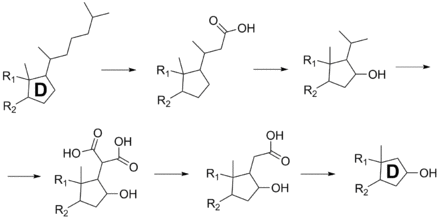 The carbon chain on the D ring of cholesterol is degraded by functionalizations with carboxyl groups and sequential decarboxylation reactions. A hydroxyl group is also installed on the adjacent carbon to yield samandarin. These steps are performed by enzymes in the salamander. The details of the biosynthesis have not been elucidated completely.