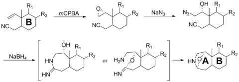 The last few steps of the synthesis is shown below. Using m-chloroperobenzoic acid, an epoxide is created onto the alkene. The addition of sodium azide will facilitate the anti-Markovnikov opening of the epoxide. Reduction with sodium borohydride completes the azaheterocycle and bridged oxazolidone through either a cyclic amidine intermediate or imino ester intermediate.