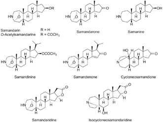 Samandarin or Samandarine is the main steroidal alkaloid secreted by the fire salamander (Salamandra salamandra).[1] The compound is extremely toxic (LD50 = 70 µg/kg in mice).[2] Poisoning can cause convulsions, respiratory paralysis, and eventual death.[3] Samandarin is also believed to be the active ingredient in Salamander brandy, a Slovenian drink with purported hallucinogenic and aphrodisiac effects.[4]