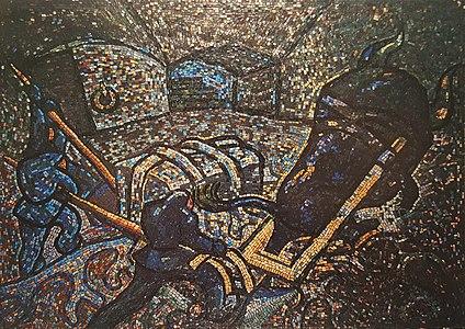 The Retrieval of Sampo, where Lemminkäinen ploughs the roots with a Pohjola bull, mosaic by Veikko Aaltona, 1940