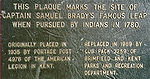 - ^ In his web page, About Captain Samuel Brady, Brad Bolton gives these additional very credible details about Captain Brady's leap. "He was on the north side of the river, and he knew he had to cross it to reach safety. Unfortunately, the only crossing places were near Standing Rock, from where he had just come. And the Indians knew it. So back he ran about eight miles with Indians in pursuit. To his dismay, upon sighting Standing Rock, he noticed Indians already waiting for him there. He knew another crossing place below the current Main Street bridge, so he turned and ran toward it. Unfortunately there were Indians waiting for him there also. The commotion upstream told this second group that Brady was nearby, so they ran upstream to meet him. Realizing he was surrounded, Brady headed for a narrow place he had seen during previous trips. Luckily, he reached the spot just before the natives, and jumped across. * * *. After landing on the ledge, he pulled himself up the bank, but was shot in the thigh before he could escape. The Indians could have killed him, but they wanted Brady alive so they could torture him. None of the Indians dared to try Brady's leap, so they headed for the two crossing places. This gave Brady the lead he needed, for he was now injured and moving slower. Leaving a trail of blood a child could follow, he headed for a nearby lake he'd seen many times along the Mahoning Trail." About Captain Samuel Brady, Brad Bolton
