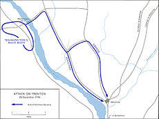 After British General William Howe captured New York City from Washington in 1776 in the New York and New Jersey campaign, he began a slow advance south through New Jersey in the direction of the Continental Capital of Philadelphia. Samuel Brady was among those who handed General Howe an unpleasant setback, by crossing the Delaware River with General Washington to fight Howe's overconfident forces at the Battle of Trenton, which took place on the morning of December 26, 1776. Trenton, New Jersey was at that time a small town in western New Jersey. Three regiments of German forces hired by the British to fight the Colonials, called "Hessians," had occupied the settlement. As year end approached, Washington had been retreating through New Jersey ahead of the British. Lost battles and constant retreat had put the morale of his army at low ebb. Many soldiers left the army as soon as their enlistments were up and others just deserted. Some of Washington's generals just ignored his orders, insulted that they had not been chosen instead of him to lead the army. Washington needed a victory for the Revolution to survive. Washington's made a hazardous nighttime crossing of the Delaware River on the night of December 25–26, 1776. He marched his tattered force of about two thousand four hundred men over the snow-covered ground to Trenton, many of his soldiers shod only with bleeding rags for shoes. General Washington attacked the Hessians in the morning and completely overwhelmed them at the cost of only light casualties to his own forces. Samuel Brady, therefore, was very much a part of this very crucial battle that gave the Americans their much needed victory and effectively kept the American Revolution alive.