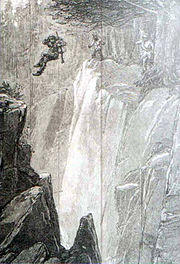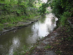 Samuel Brady gained his lasting notoriety for his leap over the Cuyahoga River around 1780 in what is now Kent, Ohio.[23] After following a band of Indians into the Ohio country, a failed ambush attempt resulted in the band chasing Brady near the Cuyahoga River. To avoid capture, Brady leaped across a 22-foot (6.7 m) wide gorge of the river (which was widened considerably in the 1830s for construction of the Pennsylvania and Ohio Canal) and fled to a nearby lake where he hid in the water under a fallen tree using a reed for air.[24] The lake, originally known as "Brady's Lake",[25] is now known as Brady Lake and is the location of a former village of the same name, Brady Lake, Ohio, which celebrated "Captain Brady Day" each summer from 1972 to 2006. The site of Brady's leap is today a park known as "Brady's Leap Park" just north of downtown Kent, Ohio.[26]