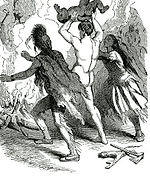 When "the great day dawned and from far and near the chiefs with their tribes assembled, to see the most frightful tortures inflicted on their enemy. The fires were lighted around him but burned low, as he was bound to a stake, while different bodies of savages came riding in on their ponies. To add to his torture too, the flames were kept in check, and his suffering would have been very severe, had the Indians not made such confusion during the arrival of their friends, that the guard was not vigilant, and he cautiously pulled at the withes which bound his wrists, and slowly, surely they broke beneath the strain. Some accounts claim that the heat enabled him to break his bonds, but it was probably due to his wonderful physical strength. Stripped of his clothing, he dashed madly across the flame of fire, according to one writer, seized a squaw, the wife of a noted chief, according to other historians her child, threw her into the fire, and in the attendant turmoil caused by his desperate deed, he made good his escape."[27]