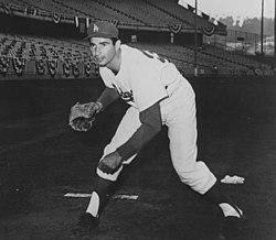 The year 1956 was not very different from 1955 for Koufax. Despite the blazing speed of his fastball, Koufax continued to struggle with his control.[34] He saw little work, pitching only 58 2&fras1;3 innings with a 4.91 earned run average, 29 walks and 30 strikeouts. When Koufax allowed baserunners, he was rarely permitted to finish the inning. Teammate Joe Pignatano said that as soon as Koufax threw a couple of balls in a row, Alston would signal for a replacement to start warming up in the bullpen. Jackie Robinson, in his final season, clashed with Alston on Koufax's usage. Robinson saw that Koufax was talented and had flashes of brilliance, and objected to Koufax being benched for weeks at a time.[35]