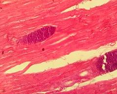Definitive diagnosis by biopsy of an infected muscle. Sarcocysts are identifiable with hematoxylin and eosin. The PAS stain may be helpful, but variable uptake of stain is common. Along with the sarcocysts, inflammatory cells may be found. Other findings include myositis, myonecrosis, perivascular and interstitial inflammation, vasculitis, and eosinophilic myositis.