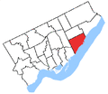 It consists of the part of the City of Toronto bounded on the west by Victoria Park Avenue, on the south by Lake Ontario, on the north by Eglinton Avenue and on the east by Markham Road.