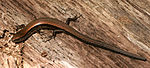 The little brown skink is a widespread and common species in most of its range. It is of conservation concern only on the northern edge of its range and can be seen in grassland or forest.