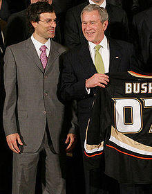 As an unrestricted free agent in the summer of 2005, Niedermayer was in considerable demand; 14 teams contacted his agent on the first day they were allowed to talk to him.[45] The Devils offered him a five-year contract that would have paid him $7.8 million per season, the maximum allowed under the new salary cap, but Niedermayer chose instead to sign a four-year contract worth $6.75 million per season with the Mighty Ducks of Anaheim.[46] He chose to take the shorter term and lower salary to play and try to win a Stanley Cup with his brother.[47] The Ducks immediately named Scott the team's captain.[48] In his first season in Anaheim, 2005–06, Niedermayer scored 63 points and was named a First Team All-Star for the second time.[11] In the playoffs, the Ducks reached the Western Conference Final, but were eliminated by the Edmonton Oilers.[49]