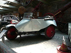 During World War I Alfred Angas Scott had made sidecar machine gun carriers. From these he developed a three-wheel car with two wheels in line and a third one set alongside but slightly behind the other rear wheel, all supported by a triangulated tubular steel frame. Although the layout still resembled that of a motorcycle and sidecar combination, it had wheel steering by rack and pinion. Its power was supplied by the Scott Company's own water-cooled 578 cc twin-cylinder two-stroke engine with drive transmitted through a three-speed gearbox to the offside rear wheel by shaft. There was no reverse gear. Turning was dangerous at speed.[1]