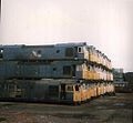 A breaker's yard in the UK, showing cars stacked on metal frames to make it easier to find and remove usable parts.