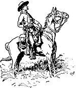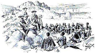 Soon after the outbreak of the war, Baden-Powell was assigned to Matabeleland as chief of staff to Gen. Carrington and it was here that he first met and began a lifelong friendship with Frederick Russell Burnham, the American-born Chief of Scouts for the British.[51] This would become a formative experience for Baden-Powell not only because he had the time of his life commanding reconnaissance missions into enemy territory, but because many of his later Boy Scout ideas took hold here.[52] Burnham had been a scout practically his entire life in the United States when he went to Africa in 1893 to scout for Cecil Rhodes on the Cape-to-Cairo Railway. As Chief of Scouts under Major Allan Wilson, Burnham became known in Africa as he-who-sees-in-the-dark and he gained fame in the First Matabele War when he survived the British equivalent of Custer's Last Stand, the Shangani Patrol.[53]