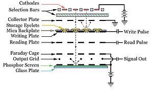 Reading was accomplished by scanning the reading gun across the storage area. This gun was set to a voltage that would cross the secondary emission threshold for the entire display. If the scanned area held the holding gun potential a certain number of electrons would be released, if it held the writing gun potential the number would be higher. The electrons were read on a grid of fine wires placed behind the display, making the system entirely self-contained. In contrast, the Williams tube's read plate was in front of the tube, and required continual mechanical adjustment to work properly.[6] The grid also had the advantage of breaking the display into individual spots without requiring the tight focus of the Williams system.