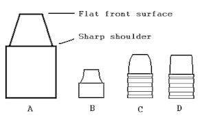 The Keith-style SWC has been taken even further, to produce designs that are nearly wadcutters in shape (D), but are intended for large game hunting with handguns. These have nearly cylindrical noses, which are as long as the firearm chamber allows, and just slightly smaller than bore diameter so they will easily chamber. The massive nose provides a large surface area for producing large wound channels, resulting in rapid incapacitation, and the heavy bullet provides excellent penetration. The wide nose is less prone to deformation than a narrow nose, allowing the bullet to keep its shape and continue to penetrate even if it encounters bone.[4]