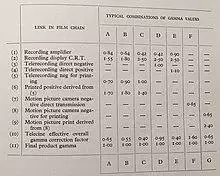 However, some idea of the variations which may be encountered is gained from the table on Figure 2. In system 'A' a telerecording negative is printed before final transmission and, by some standards, the recording amplifier gamma is high, the display tube and film print gammas are low and the final telecine gamma correction is somewhat high. By comparison, system 'C' employs a much lower recording amplifier gamma, higher display tube and print film gamma values, and a relatively lower telecine gamma correction.