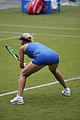 Elena Vesnina waiting to receive a serve in partial squatting position.