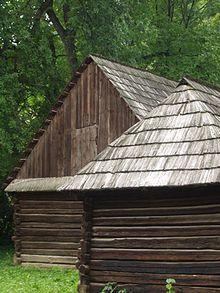 Historically, wooden shingles were usually thin (3&fras1;8 to 3&fras1;4 in or 10 to 19 mm), relatively narrow (3 to 8 in or 76 to 203 mm), of varying length (14 to 36 in or 360 to 910 mm), and almost always planed or knifed smooth. The traditional method for making wooden shingles before the 19th century was to rive (hand split) them from straight-grained knot-free sections of logs pre-cut to the desired length known as bolts. These bolts were quartered or split into wedges. A mallet and froe (or axe) were used to split or rive out thin pieces of wood. The wood species varied according to available local woods, but only the more durable heartwood, or inner section, of the log was usually used. The softer sapwood generally was not used because it deteriorated quickly. Because hand-split shingles were somewhat irregular along the split surface, it was necessary to dress or plane the shingles on a shaving horse with a drawknife or draw-shave to make them fit evenly on the roof.[2] This reworking was necessary to provide a tight-fitting roof over typically open shingle lath or sheathing boards. Dressing, or smoothing of shingles, was almost universal, no matter what wood was used or in what part of the world the building was located, except in those cases where a temporary or very utilitarian roof was needed.[3]