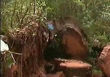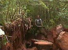 Before helicopters came into common use for transporting the slings, they were sometimes processed in the bush and finished, hand-split shakes were carried out in a pack frame. In steep areas, cables were strung along the slope to form a tight-line or tyrolean. Staples were driven into a block straddling the cable, and the block was slid down the cable to a landing accessible to a boat or truck.