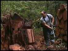 Logs are typically cut into appropriate lengths using a chainsaw, then the "ringers" or cuts are split with an axe into cubes which are small enough to handle, usually 45 to 204 kilograms (100 to 450 lb), then stacked on a rope. The rope is looped around the stacked wood and the ends passed through an eye spliced in the end. When the running end is pulled it tightens the "sling" rope around the blocks preventing them from falling out. The slings are then flown to a central location where they can be loaded on pallets for transport. Previously, swede saws, crosscut saws and hand saws may have been used to cut the logs, and a froe (a heavy blade 24 in [610 mm] long and 3 in [76 mm] wide with a handle at one end perpendicular to the blade) was used to split the ringers. This blade was driven into the wood using a mallet, then the wood could be pried apart by pulling on the handle if it would not split by driving the blade in alone.