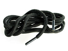 Shoelaces, also called shoestrings (US English) or bootlaces (UK English), are a system commonly used to secure shoes, boots, and other footwear. They typically consist of a pair of strings or cords, one for each shoe, finished off at both ends with stiff sections, known as aglets. Each shoelace typically passes through a series of holes, eyelets, loops or hooks on either side of the shoe. Loosening the lacing allows the shoe to open wide enough for the foot to be inserted or removed. Tightening the lacing and tying off the ends secures the foot firmly within the shoe. The laces can be tied in different shapes, most commonly a simple bow.