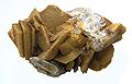 Siderite is commonly found in hydrothermal veins, and is associated with barite, fluorite, galena, and others. It is also a common diagenetic mineral in shales and sandstones, where it sometimes forms concretions, which can encase three-dimensionally preserved fossils.[5] In sedimentary rocks, siderite commonly forms at shallow burial depths and its elemental composition is often related to the depositional environment of the enclosing sediments.[6] In addition, a number of recent studies have used the oxygen isotopic composition of sphaerosiderite (a type associated with soils) as a proxy for the isotopic composition of meteoric water shortly after deposition.[7]