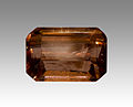 It crystallizes in the trigonal crystal system, and are rhombohedral in shape, typically with curved and striated faces. It also occurs in masses. Color ranges from yellow to dark brown or black, the latter being due to the presence of manganese.