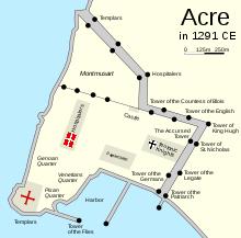 Acre was defended by an inner and outer wall, with a total of twelve towers built by European kings and rich pilgrims.[22][23][24]