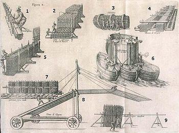 He ordered troops to throw up causeways of earth and fascines across the Yperlet stream which was shielded by constructed gabions.[95] The inventions were not helping the Spanish however as Targone's mobile drawbridge mounted on four ten foot wheels was damaged and immobilized by a single cannon shot; it was then destroyed by more fire from the besieged after which it was abandoned.[92]