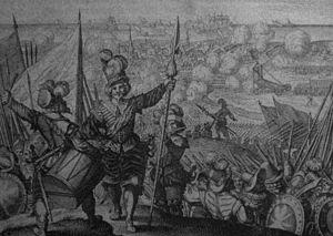 Vere made sure it was heavily guarded and placed Sir John Ogle's company there but was awoken by the alarm and rushed to the ramparts to discover the Spanish were assaulting the breach.[58] A force of 3 – 4,000 Spanish attempted to storm the position; the phalanx of Spanish pikemen managed to gain the breach but were forced out by a counterattack.[47] The Spanish then launched further attacks but were repelled again.[56] A fierce struggle ensued, and the besiegers were driven back while Vere ordered wisps of straw to be set alight and fixed on the ends of the pikes, so that the retreating Spaniards might be fired upon with effect as they fell back.[59] The assault never made it past the breach as the Spanish found the rubble almost impossible to fight on and suffered heavy casualties.[56] In the end the attack was a disaster and after half an hour the Spanish had lost over 500 men, nearly a quarter of the attacking force.[57][58]