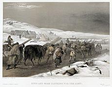 British lithograph published March 1855, after a water-colour by William Simpson, shows winter military housing under construction with supplies borne on soldiers' backs. A dead horse, partially buried in snow, lies by the roadside.