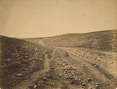 A view of the "Valley of the Shadow of Death" near Sevastopol, taken by Roger Fenton in March 1855. It was so named by soldiers because of the number of cannonballs that landed there, falling short of their target, during the siege.[32]