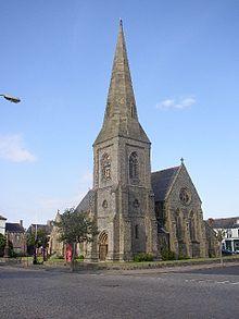 Silloth's largest church is Christ Church, situated in a complete rectangular plot which was planned into the original town design. It is on a commanding site at Criffel Street and the body of the church was completed in 1870.[7] The porch tower and large broach spire were completed later in 1878, and house a ring of 8 bells which are chimed. It was designed by Carlisle architect Charles John Ferguson in the Gothic style, and is built with an interesting mix of local sandstone, and granite which was brought by the North British Railway from Newry in Northern Ireland. Much of the interior is faced with yellow brick trimmed with red.[8]