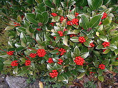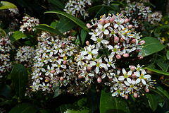 Skimmia is a genus of four species of evergreen shrubs and small trees in the Rue family, Rutaceae, all native to warm temperate regions of Asia. The leaves are clustered at the ends of the shoots, simple, lanceolate, 6–21 cm long and 2–5 cm broad, with a smooth margin. The flowers are in dense panicle clusters, each flower small, 6–15 mm diameter, with 4-7 petals. The fruit is red to black, 6–12 mm diameter, a fleshy drupe containing a single seed. All parts of the plant have a pungent aroma when crushed.[1] The botanical name, Skimmia, is a Latinization of shikimi (シキミ, 樒), which is the Japanese name for Illicium religiosum as well as an element in miyama shikimi (ミヤマシキミ, 深山樒), the Japanese name for Skimmia japonica.