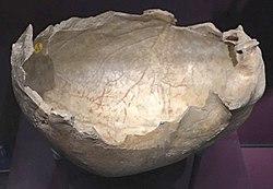The oldest directly dated skull cup[1] at 14,700 cal BP (12,750 BC) comes from Gough's Cave, Somerset, England. Skulls used as containers can be distinguished from plain skulls by exhibiting cut-marks from flesh removal and working to produce a regular lip.[2]