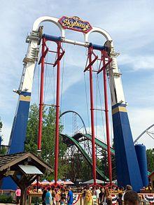 Skyhawk is a Screamin' Swing type ride built by S&S Worldwide. The structure itself is 103 feet (31 m) tall at its highest point, the equivalent height of a ten-story building, making it the world's largest swinging thrill ride. It consists of two swinging arms, both 84 feet (26 m) tall, seating 20 across and 20 back to back (40 total).[1] At full swing, the ends of the arms approach 125 feet (38 m) high off the ground—as high as a twelve-story building—and achieve a maximum velocity of 65 miles-per-hour—faster than most wooden roller coasters. The ride lasts about one minute, and can accommodate 800 passengers per hour. Riders must be 48 inches (1,200 mm) or taller.[2] Riders are restrained by a lap bar.[3]