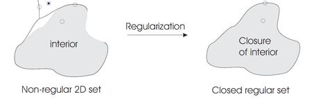 According to the continuum point-set model of solidity, all the points of any X ⊂ ℝ3 can be classified according to their neighborhoods with respect to X as interior, exterior, or boundary points. Assuming ℝ3 is endowed with the typical Euclidean metric, a neighborhood of a point p ∈X takes the form of an open ball. For X to be considered solid, every neighborhood of any p ∈X must be consistently three dimensional; points with lower-dimensional neighborhoods indicate a lack of solidity. Dimensional homogeneity of neighborhoods is guaranteed for the class of closed regular sets, defined as sets equal to the closure of their interior. Any X ⊂ ℝ3 can be turned into a closed regular set or regularized by taking the closure of its interior, and thus the modeling space of solids is mathematically defined to be the space of closed regular subsets of ℝ3 (by the Heine-Borel theorem it is implied that all solids are compact sets). In addition, solids are required to be closed under the Boolean operations of set union, intersection, and difference (to guarantee solidity after material addition and removal). Applying the standard Boolean operations to closed regular sets may not produce a closed regular set, but this problem can be solved by regularizing the result of applying the standard Boolean operations.[3] The regularized set operations are denoted ∪∗, ∩∗, and −∗.