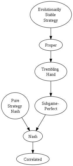 Many solution concepts, for many games, will result in more than one solution. This puts any one of the solutions in doubt, so a game theorist may apply a refinement to narrow down the solutions. Each successive solution concept presented in the following improves on its predecessor by eliminating implausible equilibria in richer games.