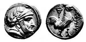 Coin of Sophytes. Obv: Sophytes in profile with tight helmet and wreath. Rev: Cock standing to right, with caduceus, and legend in Greek: ΣΩΦΥΤΟΥ "Sophytes". | |