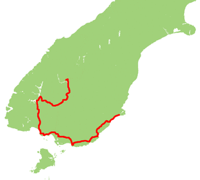 The Route runs in a U shape from Queenstown to Dunedin.[1] Skirting the eastern boundary of Fiordland National Park, it passes Manapouri and Tuatapere. At Te Waewae Bay the coast is reached and the route swings eastward towards Orepuki, Colac Bay and Riverton. At Lorneville the New Zealand state highway network is joined, and the Southern Scenic Route runs on State Highway 6 for just eight kilometres south into Invercargill.