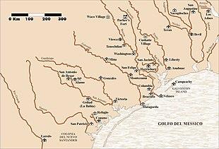 Spanish Texas (Tejas) was a colonial province within the northeastern mainland region of the Viceroyalty of New Spain. On its southern edge, Tejas was bordered by the province of Coahuila. The boundary between the provinces was set at the line formed by the Medina River and the Nueces River, 100 miles (161 km) northeast of the Rio Grande.[1] On the east, Texas bordered La Louisiane (French Louisiana). Although Spain claimed that the Red River formed the boundary between the two, France insisted that the border was the Sabine River, 45 miles (72 km) to the west.[2] After Mexican independence from Spain, it was within Coahuila y Tejas from 1824 to 1835.