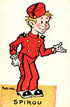 The comic strip was originally created by Rob-Vel for the launch of Le Journal de Spirou (Spirou magazine) on April 21, 1938, published by Éditions Dupuis.[1] The main character was originally an elevator (lift) operator (in French: un groom) for the Moustique Hotel (in reference to the publisher's chief magazine, Le Moustique), and remained dressed in his red bellhop uniform for a long time after the occupation was dropped. Spirou (the name means "squirrel" (lit.) and "mischievous" (fig.) in Walloon) has a pet squirrel called Spip, the series' first supporting character, who was introduced on June 8, 1939 in the story arc titled L'Héritage de Bill Money and liberated in the following week's issue, remaining a presence in all Spirou stories since.[2][3]