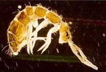 Springtails are well known as pests of some agricultural crops. Sminthurus viridis, the lucerne flea, has been shown to cause severe damage to agricultural crops,[63] and is considered as a pest in Australia.[64][65] Onychiuridae are also known to feed on tubers and to damage them to some extent.[66] However, by their capacity to carry spores of mycorrhizal fungi and mycorrhiza helper bacteria on their tegument, soil springtails play a positive role in the establishment of plant-fungal symbioses and thus are beneficial to agriculture.[67] They also contribute to controlling plant fungal diseases through their active consumption of mycelia and spores of damping-off and pathogenic fungi.[68][69] It has been suggested that they could be reared to be used for the control of pathogenic fungi in greenhouses and other indoor cultures.[70][71]
