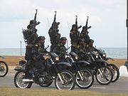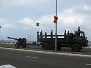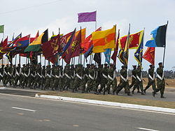The Sri Lankan Army (SLA) (Sinhala: ශ්‍රී ලංකා යුද්ධ හමුදාව, romanized: Śrī Laṃkā yuddha hamudāva; Tamil: இலங்கை இராணுவம், romanized: Ilankai iraṇuvam) is the oldest and largest of the Sri Lanka Armed Forces. Established as the Ceylon Army in 1949, it was renamed when Sri Lanka became a republic in 1972. In 2010, the Army had approximately 200,000 regular personnel, between 20,000 and 40,000 reserve (volunteer) personnel and 18,000 National Guardsmen[3][4] and comprises 13 operational divisions, one air-mobile brigade, one commando brigade, one special forces brigade, one independent armored brigade, three mechanized infantry brigades and over 40 infantry brigades.[5] From the 1980s to 2009 the army was engaged in the Sri Lankan Civil War.