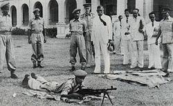 First Prime Minister of Independent Sri Lanka D. S. Senanayake visiting the 1st battalion of the CLI at the Echelon Square and watching volunteers being trained to handle light machine guns