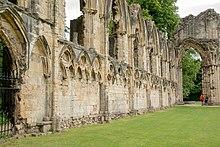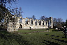 The original church on the site was founded in 1055 and dedicated to Saint Olaf. After the Norman Conquest the church came into the possession of the Anglo-Breton magnate Alan Rufus who granted the lands to Abbot Stephen and a group of monks from Whitby. The abbey church was refounded in 1088[1][3] when the King, William Rufus, visited York in January or February of that year[4] and gave the monks additional lands. The following year he laid the foundation stone of the new Norman church and the site was rededicated to the Virgin Mary.[5][6] The foundation ceremony was attended by bishop Odo of Bayeux and Archbishop Thomas of Bayeux.[2] The monks moved to York from a site at Lastingham in Ryedale in the 1080s and are recorded there in Domesday.[2] Following a dispute and riot in 1132, a party of reform-minded monks left to establish the Cistercian monastery of Fountains Abbey.[7] In 1137 the abbey was badly damaged by a great fire.[5] The surviving ruins date from a rebuilding programme begun in 1271 and finished by 1294.